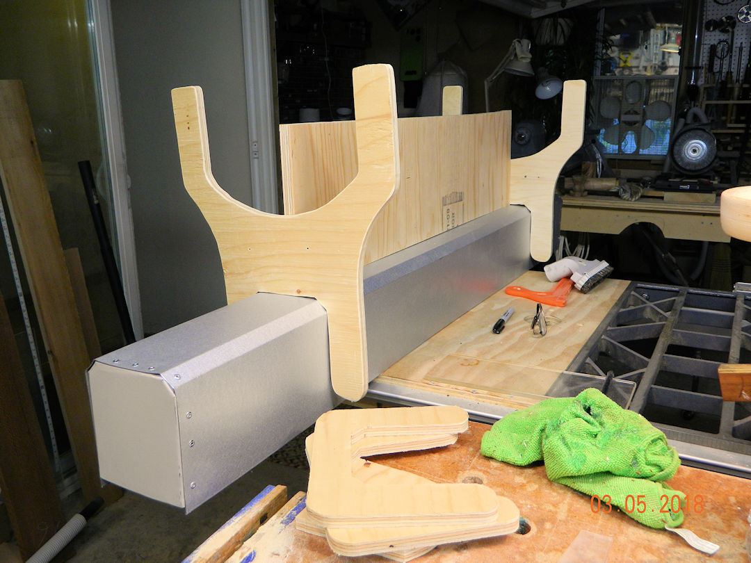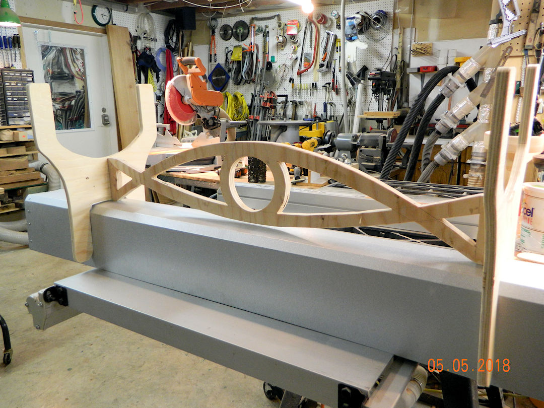 The leg spreader sitting in place. Remember this thing is upside down on the bench. Now you can see where the 'not so easy' cuts were. What you can't see is that at one of the skinny end crosses, there was s big void in the plywood that had to be filled. (05:05:2018) |