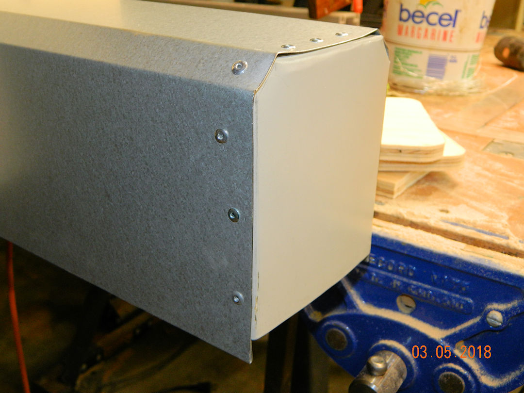 This is the new end cap. The pipe was part of the stuff we had made for our raised strawberry patch. They started off with this 5 foot unit, the guy in the shop not believing we wanted two 10 foot sections. I made the end caps and pop riveted them in place. They are not sealed, to allow for drainage when they get over watered. (03:05:2018) |