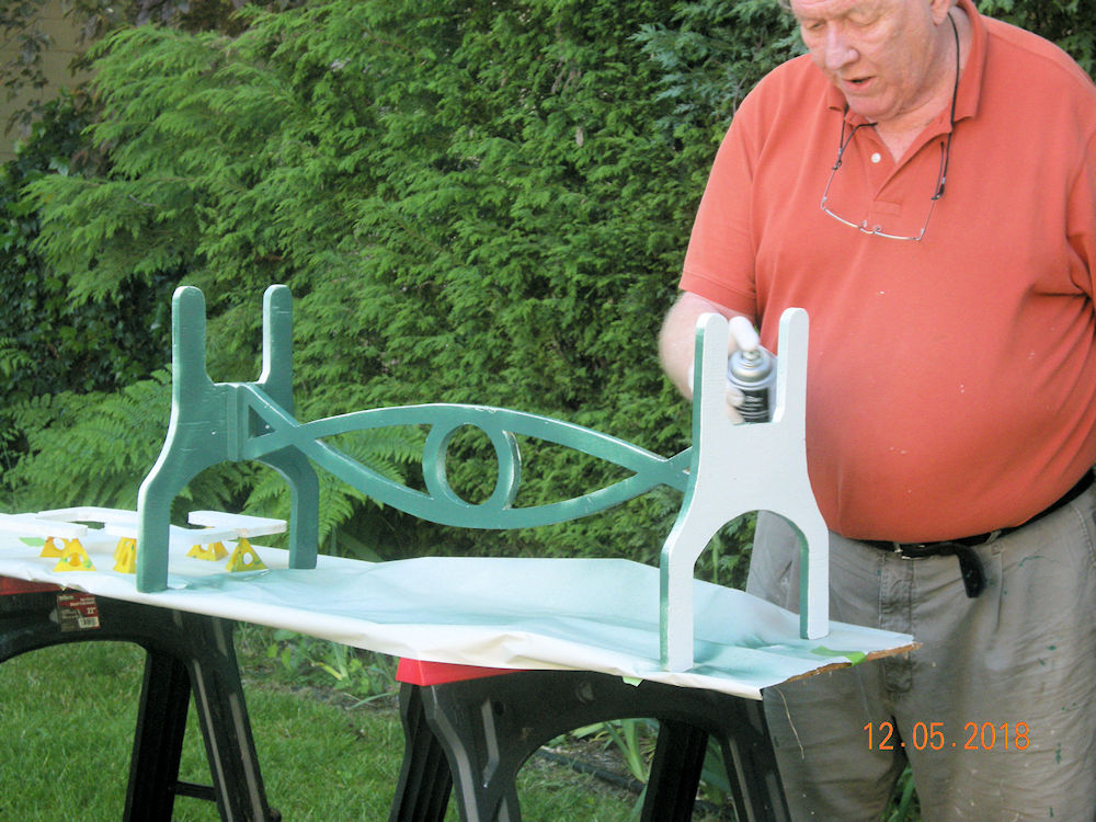 Legs getting a first coat of aerosol "Carey green" paint (getting so everything outside is accented in green) after a brush on coat of outdoor primer. (05:05:2018) |