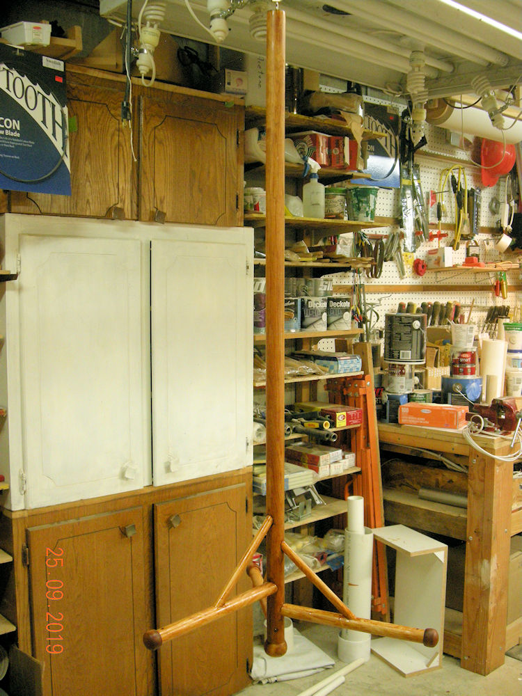 This is the new mounting base. Turned from pressure treated SPF. This is while the second coat of stain is still wet and shiny.