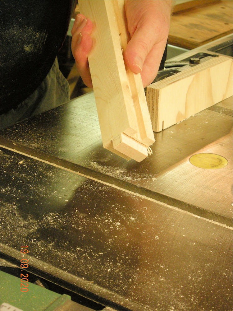 After cutting to length on the chop saw, they are cut to width on the table saw. In this case it is part of the frame