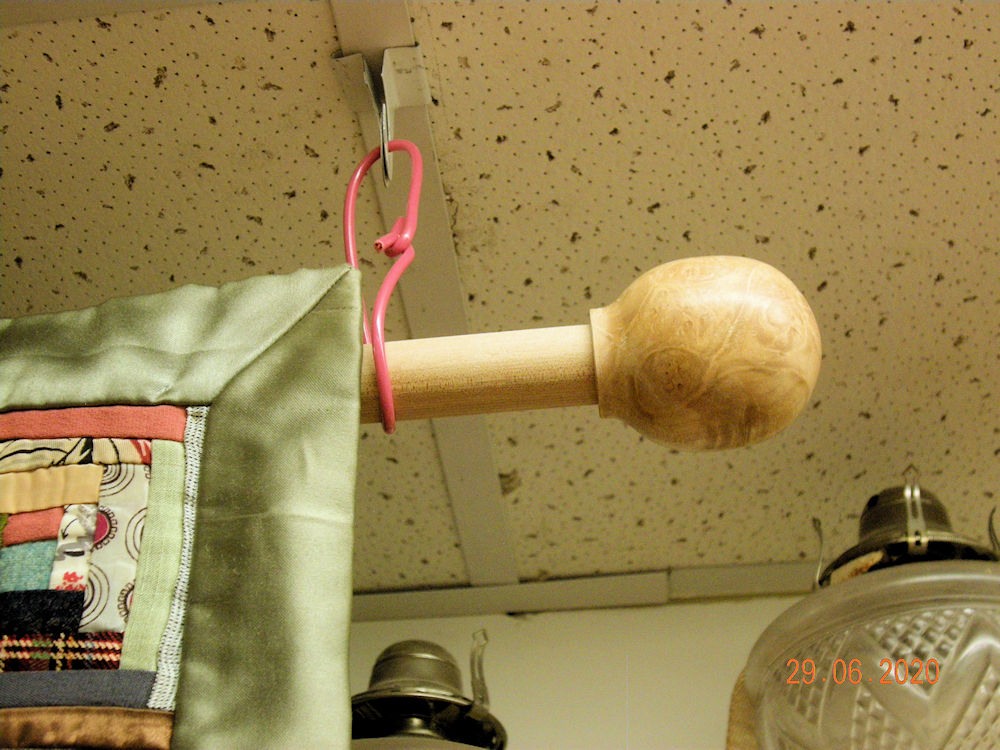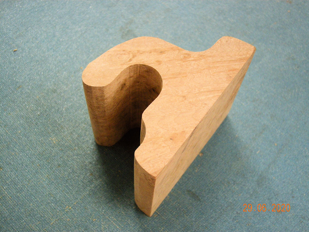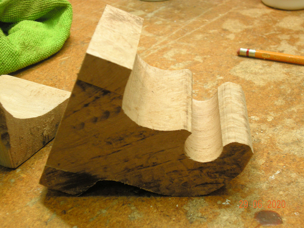 Having had the error of my design explained too me, here is the redesigned brackets. It is not going to hold the rod as far from the wall as try one did. Remember this is a unique chunk of wood that can't be matched, so bracket two HAD to be cut from bracket one!
