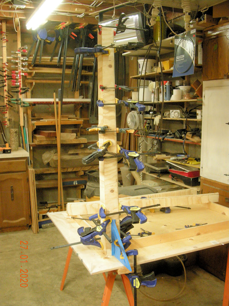 The glue-up process. Lots of clamps and speed squares to hold it straight before the pin nails are put in. Note the blue speed square at the bottom front. I have a couple of these cheap (you might say they came from $1.49 day sale at Home Hardware) plastic speed squares notched so I can use clamps to hold things square for glue up.