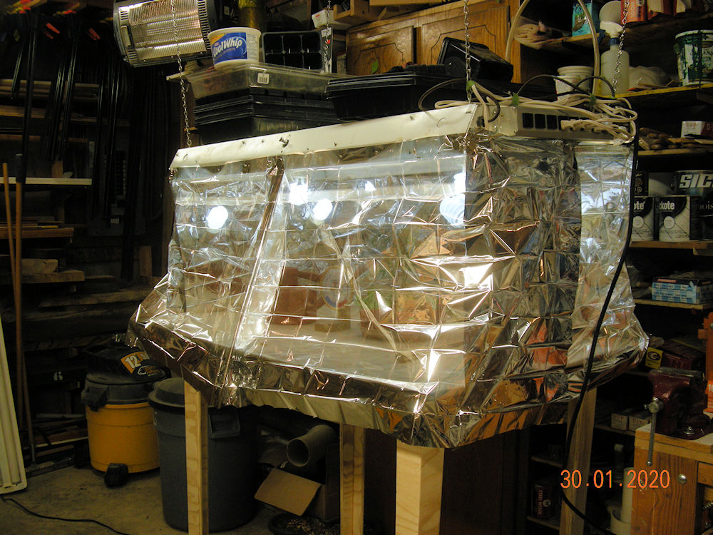 After lowering the lights, and wrapping it with mylar "space" blanket, this is where the summer's worth of seeds are started.