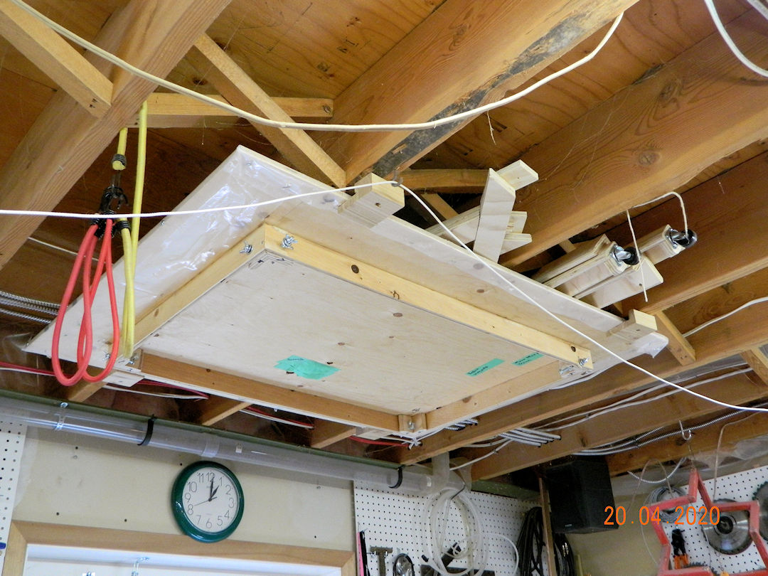Here is the reason for all the playing around making this so it would fold up. Legs, top, bracing all stored out of the way in the ceiling of the shop till next spring.