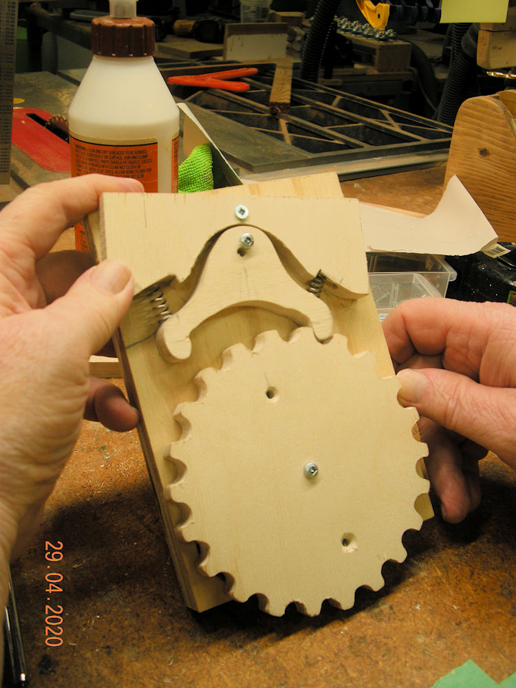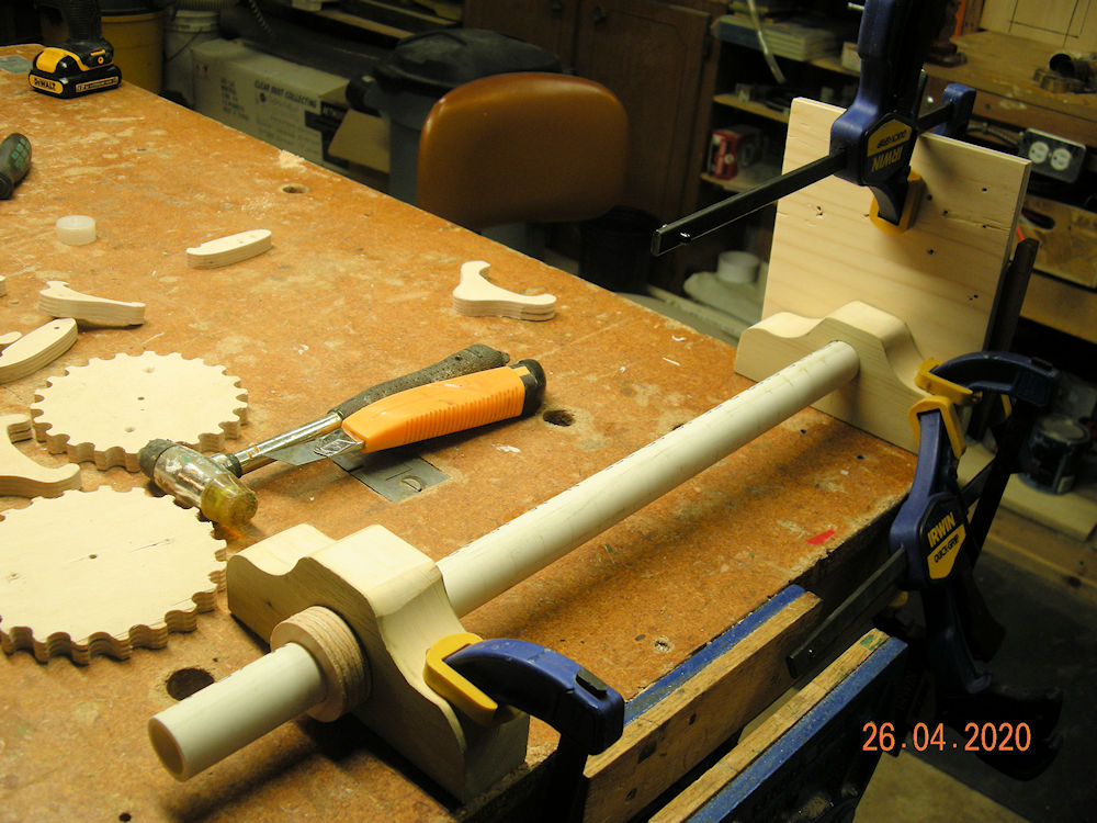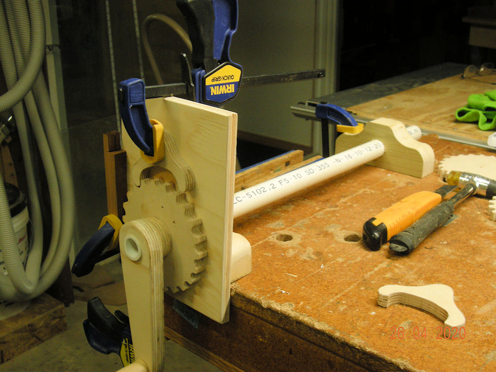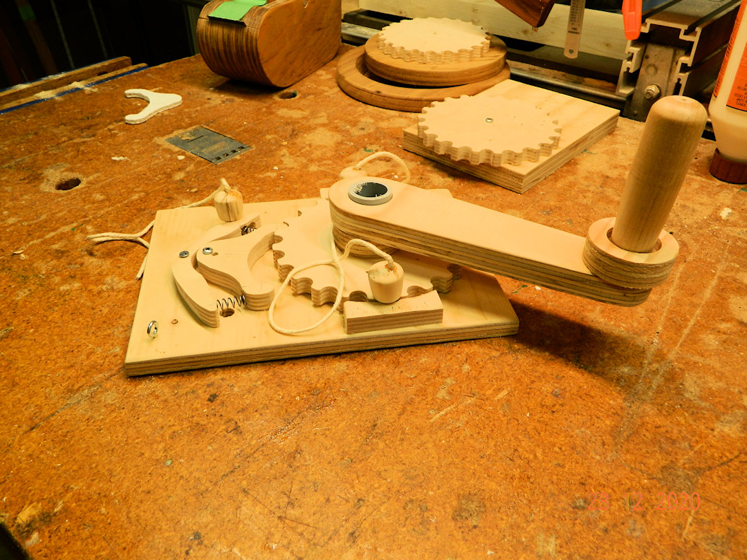 From the front! The crank shaft is 3/4 inch plywood, and the handle is maple dowel turned to shape on the lathe. The gear is 1/2 inch Baltic Burch plywood made in 2019.
