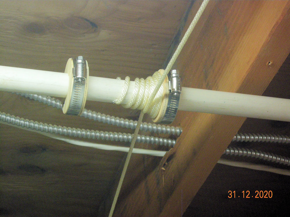 Guides to force the rope to pile up evenly added to both ends of the shaft. They are going to take a little adjusting, but so far they seem to work. The reason for them needing to pile up evenly is that if one of the 4 ropes takes up less or more than the others the lights become uneven and the top of the fixture is used as a shelf for storage..