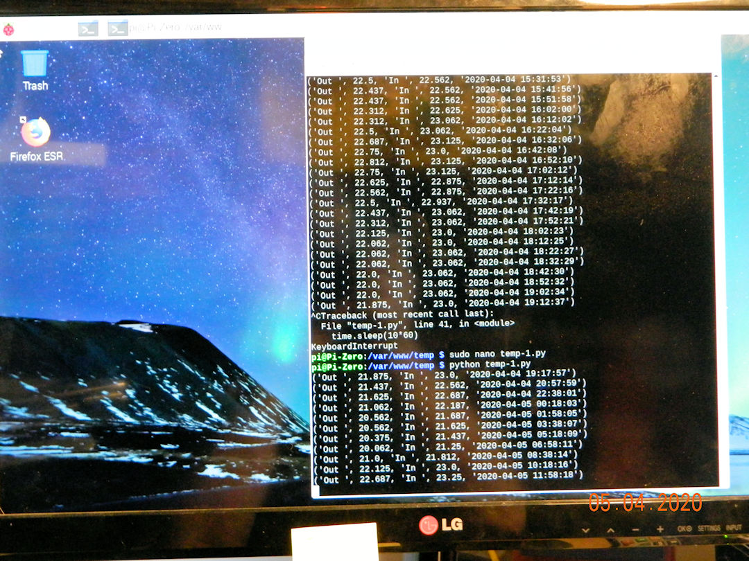 This is the HDMI TV attached to the Zero. The Zero is currently running a python program the reads the temperature sensors every 100 minutes and reports the current readings and time.